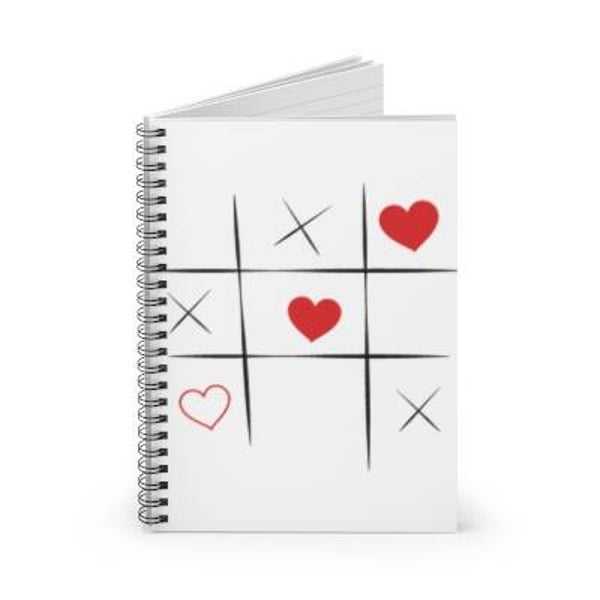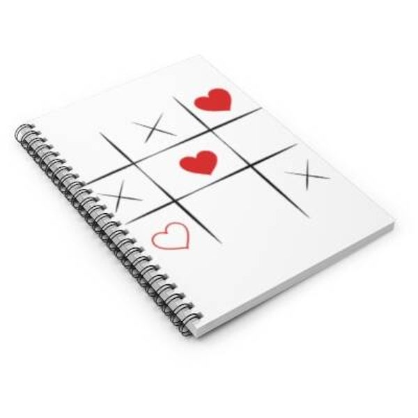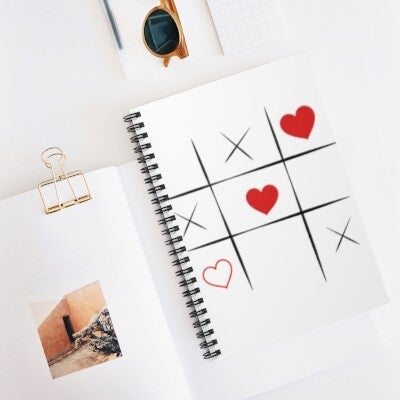 A charming spiral notebook featuring a design of hearts and tic tac toe. Perfect for jotting down notes, to-do lists, or doodles. This notebook exudes a playful and whimsical vibe, making it a great addition to any stationery collection. Ideal for students, writers, or anyone who loves unique stationery. Great for Valentine's Day, birthdays, or any occasion.