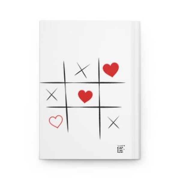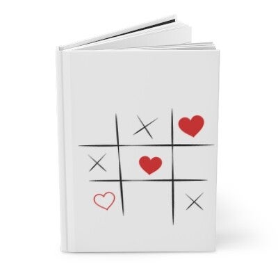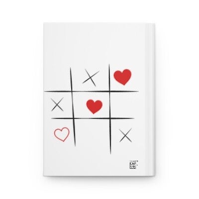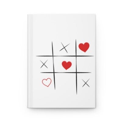 A hearts and tic tac toe themed hardcover journal, perfect for jotting down thoughts and ideas. Offers a playful and creative vibe, ideal for journaling enthusiasts, artists, and students. Great for Valentine's Day, birthdays, or as a thoughtful gift for a loved one.