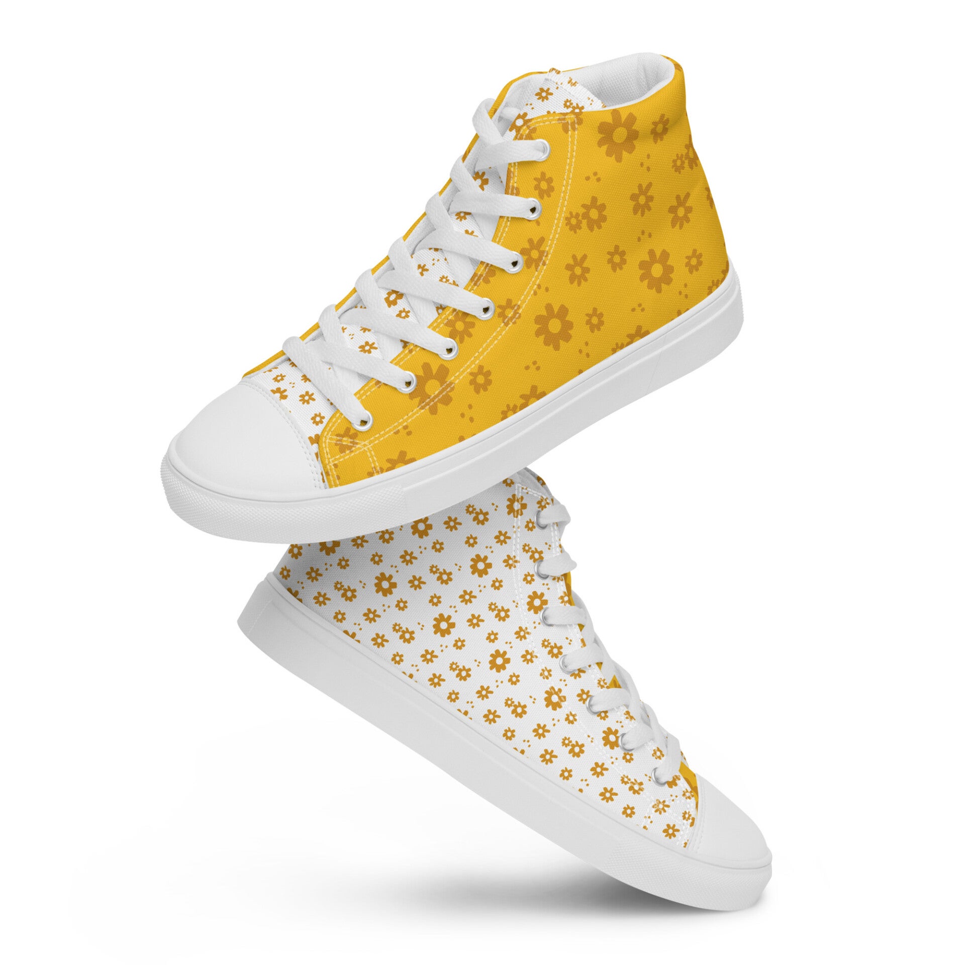 These handmade High Top Canvas Shoes have a retro feel to them, and can add the final touch to various clothing styles. Rock these cute yellow and white floral print shoes so you can look extra cute this spring and summer!
